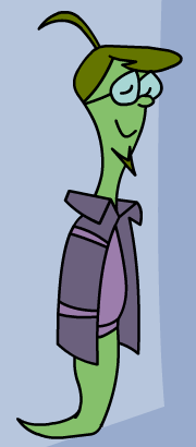 When he is calmed down as Ed Blinkenderfer, he is a light green string bean with olive green hair and a goatee.