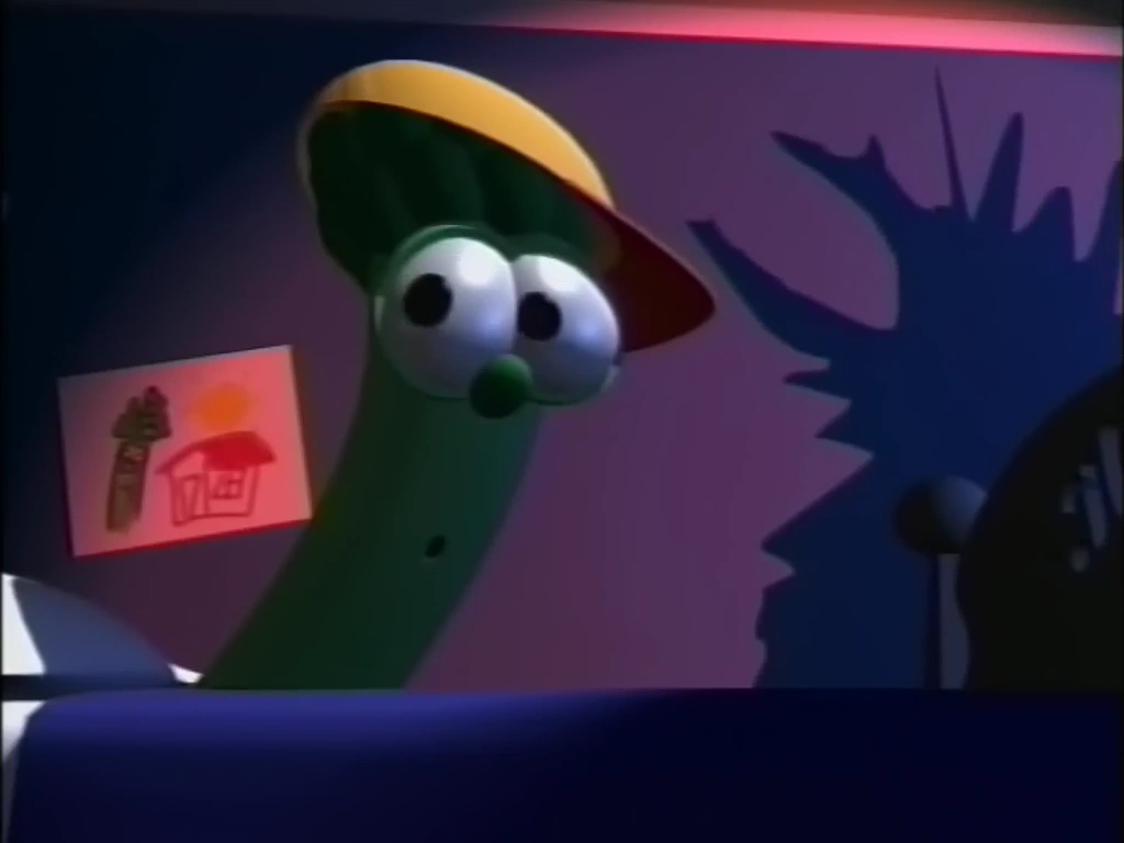 - It is unknown how Bob, Larry, Phil Winklestein (aka Frankencelery), and the closet monsters instantly left Junior's bedroom after he finished singing God is Bigger, just before Mike Asparagus came in to ask Junior what was going on. It's possible they hid in the closet.
